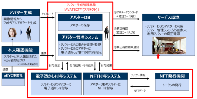 このような中で凸版印刷は、メタバース普及に伴うセキュリティリスクを低減させるために、アバターの出自や所有者情報を管理すると同時に、NFTや電子透かしによって、アバターの唯一性や真正性を証明できるアバター生成管理基盤「AVATECT™」を開発しました。