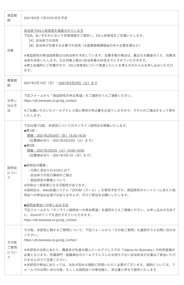 株式会社ベネッセコーポレーション(本社:岡山県岡山市、代表取締役社長:小林 仁)は、2021年5月より、全国自治体を対象としたDX人材育成に関する実証研究を開始いたします。今回の実証研究はDX(デジタルトランスフォーメーション)による地域活性化を目指し、オンライン学習ツール「Udemy for Business(ユーデミー・フォー・ビジネス)」を試験的に活用することで、全国自治体のDX人材育成やDXの実用化への効果を検証するものです。実施においては、研究にご協力いただける自治体を全国より公募し、研究してまいります。ご協力いただける自治体には、オンライン学習ツール「Udemy for Business」の実証期間内の利用をベネッセが提供し、DX人材育成を支援いたします。