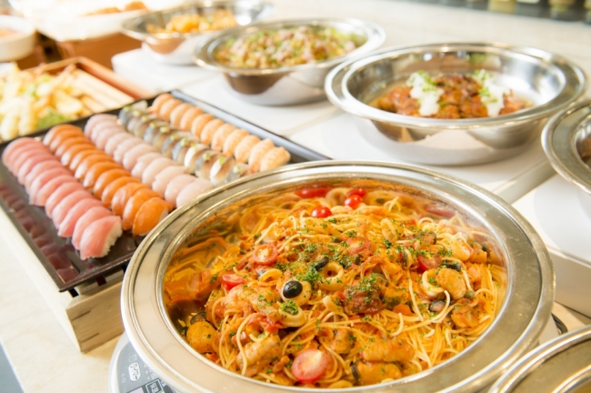コーナーでのローストビーフの提供に加え、定番の寿司・天婦羅などが勢揃い。前菜から温製料理・デザートまで約40種類のブッフェ。(ソフトト゛リンクハ゛ー付)