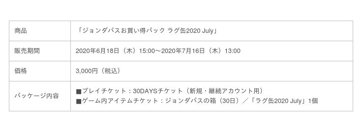 冒険に役立つサポート魔法やダンジョンなどへの転送サービス、HP&SP回復サービスなどが何度でも利用できるようになるスペシャルアイテム「ジョンダパス」。その「ジョンダパス(30日)」に「30DAYSチケット(新規・継続アカウント用)」と「ラグ缶2020 July」1個分がセットになったお得なパッケージを、2020年6月18日(木)より販売開始いたします!