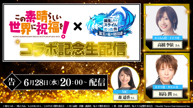 アニメ「この素晴らしい世界に祝福を!」からカズマ役の福島潤さん、めぐみん役の高橋李依さんをゲストに最新コラボ情報をお届けします。