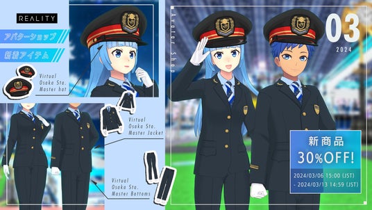新商品の駅長アバターアイテムが30% OFFの期間限定キャンペーンを開催!本ワールドの開業に合わせて、JR西日本公認の「駅長制服アバターアイテム」を発売します。リアルではなかなか着ることができない駅長制服がアバターファッションになって登場!本物さながらの“制服”を身に纏い、バーチャル大阪駅長になりきって、ライブ配信や視聴者との交流にぜひご活用ください。本ワールド開業を記念して、2024年3月13日(水) 14:59までの期間限定で新商品の駅長アバターアイテムを30%OFFのキャンペーン価格でご提供します。