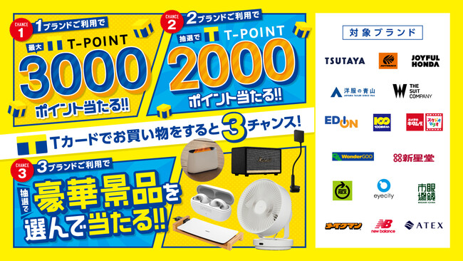 キャンペーン期間中にチャンス1のくじ引き条件を満たした方のうち、2ブランド以上ご利用された方を対象に、抽選で100名の方にTポイント2,000ポイントをプレゼントします。