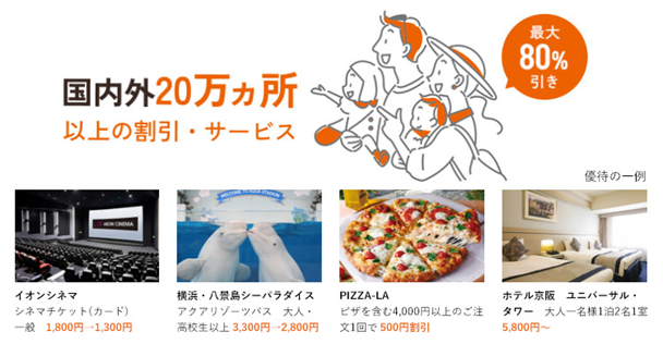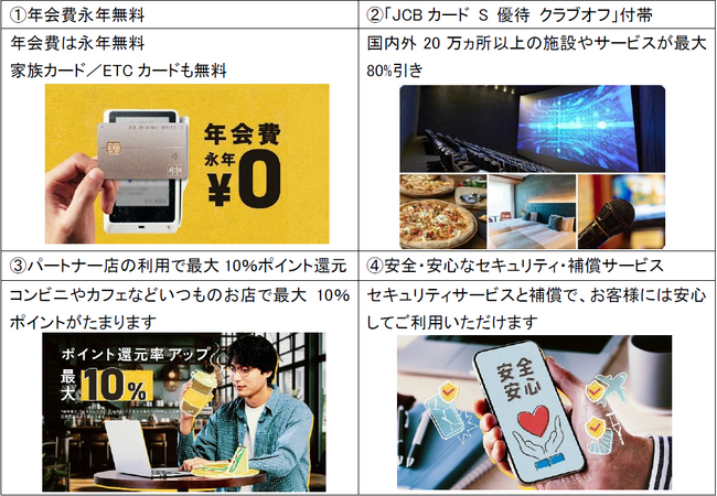 国内外20万ヵ所以上の施設やサービスで最大80%引きとなる割引・クーポンが使用できる「JCBカード S 優待 クラブオフ」を付帯しています。ゴールドカードと同等のサービスを年会費無料のカードにも付帯することで、旅行やエンタメだけでなくお近くの飲食店などの利用をより身近に・よりお得に楽しめるカードを目指しました。
