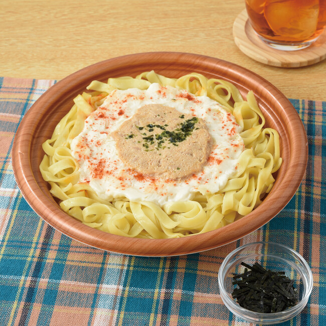 【特長】「ふくや」の人気商品「めんツナ」を使用した平打ちパスタです。マヨネーズで和えた「めんツナ」をクリームソースとあわせ、あおさをトッピングしました。
