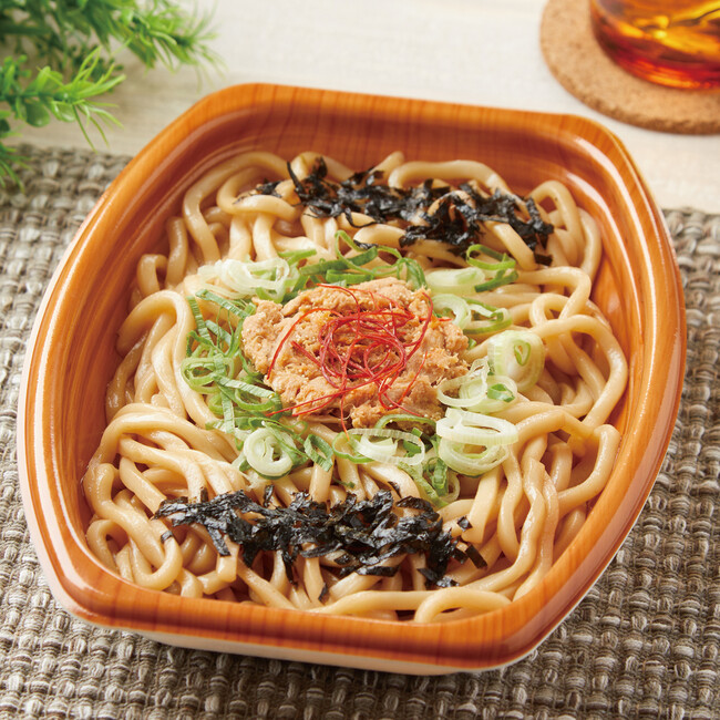 【特長】「ふくや」の人気商品「めんツナ」を使用した焼うどんです。つゆベースの焼うどんに「めんツナ」、葱、のりをトッピングしました。つゆの香りとともに、めんツナ特有のぴりりとした味を楽しむことができます。