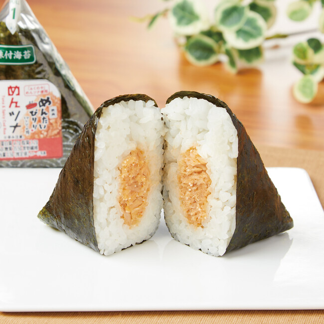 【特長】「ふくや」の人気商品「めんツナ」を入れ、味付海苔で巻く手巻タイプのおむすびです。「めんツナ」特有のぴりりとした味を楽しむことができます。