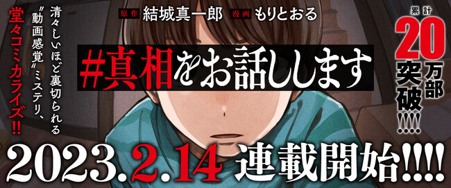 昨年6月に発売後、各所で話題沸騰、たちまち累計20万部を突破したミステリー小説『#真相をお話しします』(結城真一郎著)のコミカライズが2023年2月14日よりくらげバンチにて連載開始、さらに4月7日に第1巻を発売いたします。コミカライズ版担当はもりとおる。軽やかな筆致と卓越した人物描写を併せ持つ新鋭の漫画家です。ビジュアル化されたからこそ味わえる“感覚”をぜひご堪能ください。