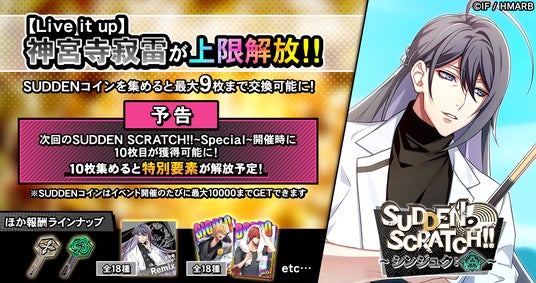 イベント期間中、KILLER SCRATCH!!をプレイするとライズ消費量に応じた確率でSUDDEN SCRATCH!!が発生します。SUDDEN SCRATCH!!をプレイすると、通常の報酬アイテムの他、限定アイテム「SUDDENコイン」を獲得することができます。「SUDDENコイン」を集めることで、「A.R.B remix」楽曲やレイズキー、シンジュク・ディビジョンのデコステッカーに使えるブースターなどと交換することが可能です。また、ストーリーカード「SSR【Live it up】神宮寺寂雷」が上限解放され、最大9枚まで獲得できます。詳細はアプリ内お知らせをご確認ください。