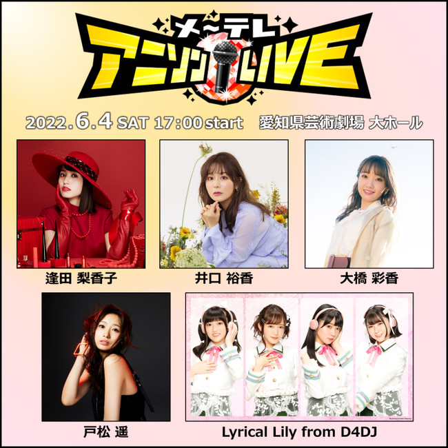 メ~テレ(名古屋テレビ放送)は、女性声優・アーティストによる一夜限りの夢のLIVE、「メ~テレアニソンLIVE」を2022年6月4日(土)愛知県芸術劇場大ホールで開催します。
