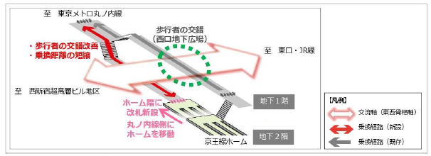 まず、一部先行分として、京王線新宿駅の地下2階ホームを北側へ移動し、ホーム北側端部に改札を新設することにより、地下2階のホーム階から東京メトロ丸ノ内線へ乗り換え可能な動線等を整備します。これにより、新宿駅西口地下広場における歩行者交錯の改善および乗り換え時間の短縮等を目指します。