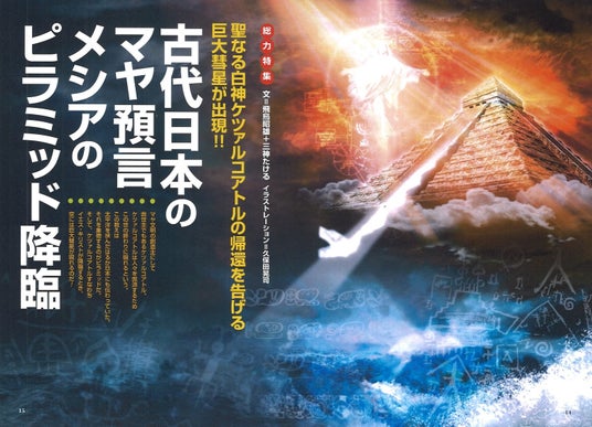 マヤ文明の創造主にして、救世主でもある白い神ケツァルコアトル。ケツァルコアトルは人々を救済するため、この世の終わりに、地上に降臨するという。しかも、この伝説はマヤ文明のみならず、インカ文明や太平洋諸島、そして、この日本にも存在した。マヤ文明と同様、この日本にもピラミッドが存在し、ここに将来、メシアの白い神が降臨する。と同時に、天空にはケツァルコアトルの到来を示す大彗星が出現し、巨大なピラミッドが地上に降りてくる!!
