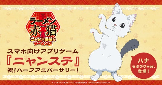 株式会社グッドスマイルカンパニー(本社:東京都千代田区、代表取締役社長:岩佐厳太郎、以下 グッドスマイルカンパニー)は、『ラーメン赤猫』公式ゲーム『ラーメン赤猫 ~ニャンて素敵なラーメン店~』(略称:ニャンステ)にてハーフアニバーサリーを記念したキャンペーンを開催することをお知らせいたします。
