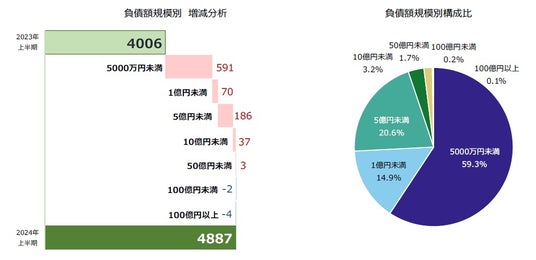 負債額規模別にみると、「5000万円未満」の倒産が2898件(前年同期2307件、25.6%増)で最も多く、全体の59.3%を占めた。次いで、「1億円以上5億円未満」は1009件(同823件、22.6%増)発生し、上半期としては2014年(1102件)以来10年ぶりに1000件を超えた。