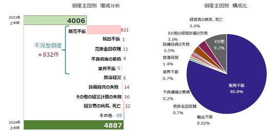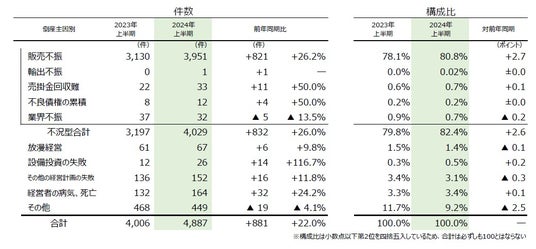 主因別にみると、「販売不振」が3951件(前年同期3130件、26.2%増)で最も多く、全体の80.8%を占めた。「売掛金回収難」(同22件→33件、50.0%増)などを含めた『不況型倒産』の合計は4029件(同3197件、26.0%増)と、上半期としては3年連続で前年を上回り、2013年(4336件)以来11年ぶりに4000件を超えた。