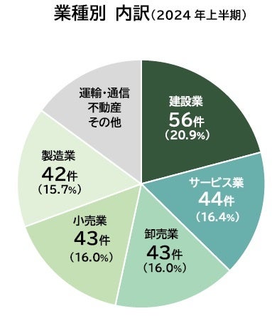 「後継者難倒産」は、268件(前年同期272件、1.5%減)発生した。上半期としては3年ぶりに前年同期を下回ったものの、250件を超え高水準で推移している。業種別では、『建設業』(56件)が最多で、『サービス業』(44件)、『卸売業』(43件)、『小売業』(43件)が続いた。
