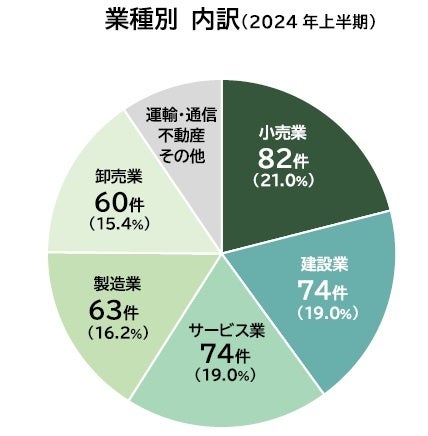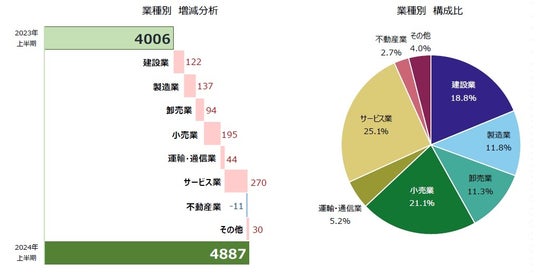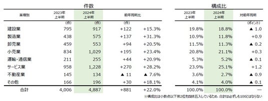 業種別にみると、全7業種中6業種で前年同期を上回った。『サービス業』(前年同期958件→1228件、28.2%増)が最も多く、『小売業』(同834件→1029件、23.4%増)、『建設業』(同795件→917件、15.3%増)が続いた。『サービス業』は上半期としては2009年(1234件)以来15年ぶりに1200件を超え、過去2番目の水準となった。