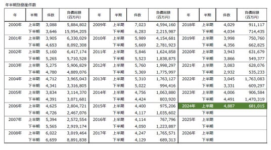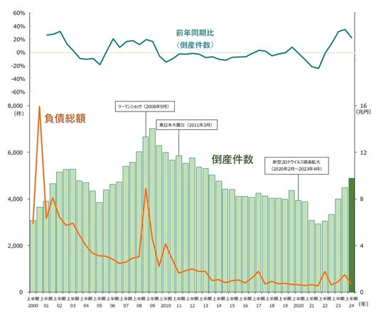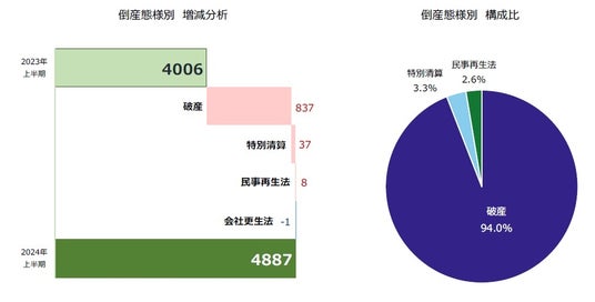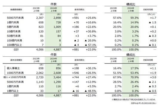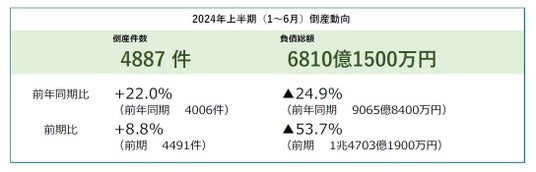 - 2024年上半期の倒産件数は4887件(前年同期4006件、22.0%増)と、前年同期に比べて881件多く、2年連続で前年同期を上回った。2014年上半期(4756件)以降で最多となった