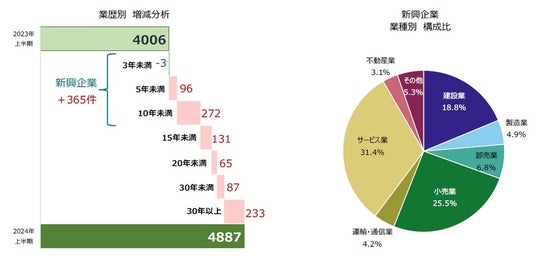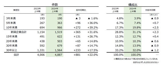 業歴10年未満の『新興企業』[「3年未満」(前年同期193件→190件、1.6%減)、「5年未満」(同267件→363件、36.0%増)、「10年未満」(同694件→966件、39.2%増)]は1519件(前年同期1154件、31.6%増)と、上半期としては3年連続で前年を上回った。内訳を業種別にみると、「サービス業」(同343件→477件)が最多、「小売業」(同291件→388件)、「建設業」(同235件→285件)が続いた。
