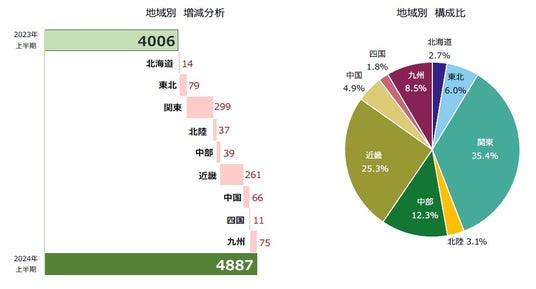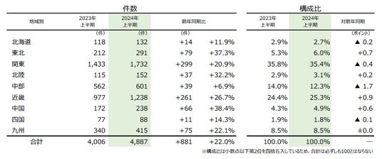 このほか、『中国』(前年同期172件→238件、38.4%増)は、2011年(238件)以来13年ぶりに多い水準となった。『九州』(同340件→415件、22.1%増)は、「福岡」(同179件→241件)の増加もあり、上半期としては2009年(515件)以来15年ぶりの高水準。