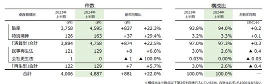 倒産態様別にみると、『清算型』倒産の合計は4758件(前年同期3884件、22.5%増)となり、全体の97.3%を占めた。『再生型』倒産は129件(同122件、5.7%増)発生し、上半期としては2年連続で前年を上回った。