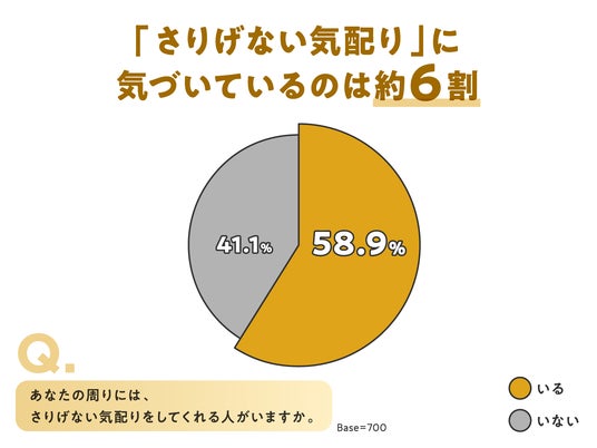 本調査で、「さりげない気配り」をしたことがあると回答した人は、約7割に及びました。一方で、「周りにさりげない気配りをしてくれる人がいる」という回答は約6割にとどまり、自分と周りの認識に実は乖離があることがわかりました。さりげない行動であるがゆえに、周りから気づかれにくいのかもしれません。