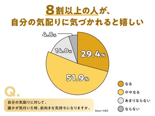 また、自分の気配りを誰かが気付いた時に前向きな気持ちになるか聞いたところ、なると回答した人は8割にも及んでいます。誰かに気づいてほしいからではなく、周囲の心地よさのために自然と行う気配りではありますが、気づいてもらえたときにはやはり嬉しい気持ちになる人が多いことが分かりました。誰かの「さりげない気配り」が、日常における心地よさを支えてくれているかもしれません。