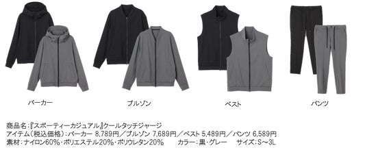 パーカー・ブルゾン・ベスト・パンツの4型を展開。アイテム数が豊富なため『スポーティーカジュアル』を使用したコーディネートはもちろん、パジャマスーツ(R)とのスポーツミックスなカジュアルスタイリングも可能です。