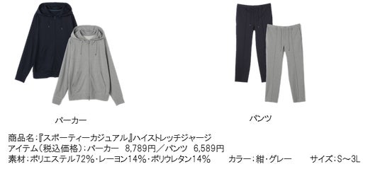 『スポーティーカジュアル』は、スポーツウェアのような楽な着心地、コーディネート次第で様々なシーンに着用できる、簡単にスタイリングが決まるなど「フリーな着心地、フリーなスタイル」を目指した、新しいカジュアルウェアです。特に、AOKIの強みである「きちんと感」にこだわり、上質な艶感のある素材や、コットンライクな風合いのジャージ素材を採用し、色味も黒・グレー・紺のみで展開。パーカーやパンツのシルエットをややスリムにし、パンツにはクリースラインを表現するステッチを施すことで、ビジネスシーンにも着用できる「きちんと感」を追求しました。加えて、本商品は「パジャマスーツ(R)」との相性も計算して企画しており、きれい目なスポーツミックススタイリングとしてビジネスシーンでもお召しいただけます。