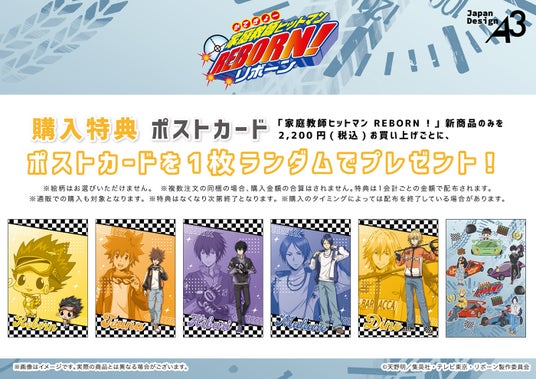 TVアニメ『家庭教師ヒットマンREBORN!』の新商品のみを2,200円(税込)お買い上げごとにポストカード(全5種)をランダムで1枚、プレゼントします!
