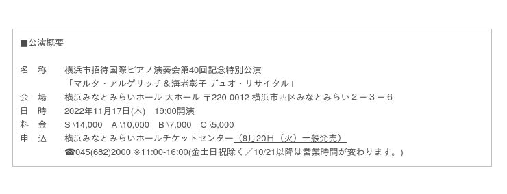 1982年に創設以来、「横浜市招待国際ピアノ演奏会」では、将来が嘱望される才気あふれる若きピアニストたちを紹介し続けてきました。横浜みなとみらいホールが改修工事を終えて再開館する今年、第40回という大きな節目にあたり、第29回からこの演奏会の企画委員長を務める海老彰子と長年にわたる篤い友情で結ばれたマルタ・アルゲリッチを迎えてデュオ公演が実現します。