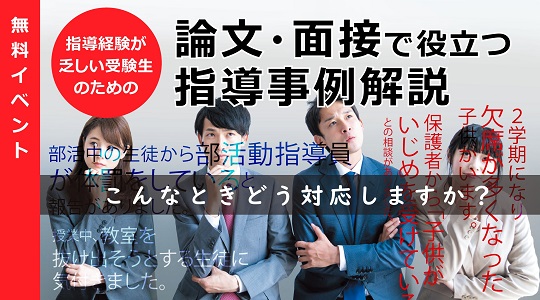 当セミナーでは、試験で問われる学習指導・生徒指導の事例について、基本的な考え方と具体的な対応方法を解説します。採用試験はもちろん、その先の学校現場にも通じる対応力を事例形式で学びましょう!