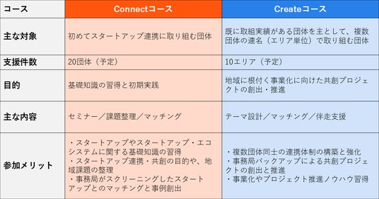 具体的には、主に初めてスタートアップ連携に取り組む団体を対象とした「Connect(コネクト)コース」と、実践的な共創プロジェクトの創出・推進を目指す団体を対象とした「Create(クリエイト)コース」の2つのコースを設定しています。