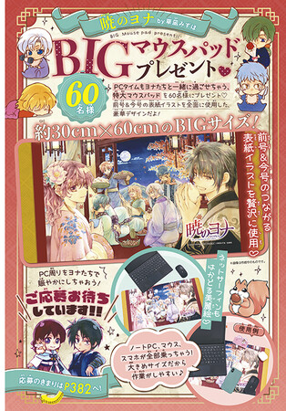 さらに、「暁のヨナ」BIGマウスパッドプレゼント企画も実施中です。前号&今号のつながる表紙イラストを贅沢に使用した約30cm×60cmの特大マウスパッドを60名様にプレゼント! ぜひご応募ください。