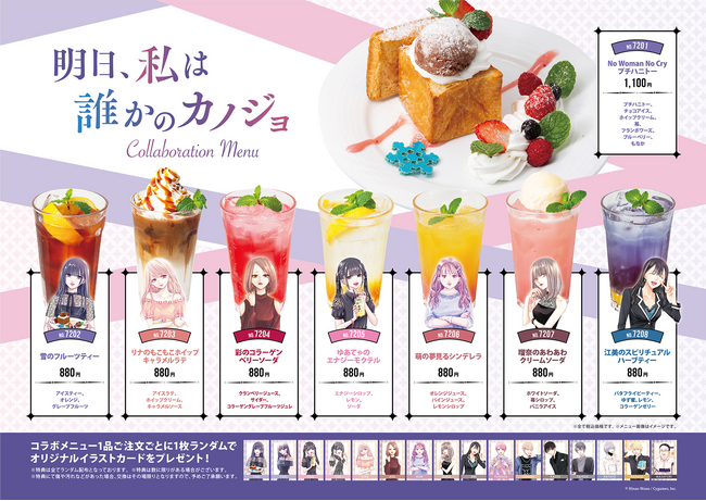 コラボ開催期間中、『明日カノ』のキャラクターにちなんだコラボメニュー(フード全1種、ドリンク全7種)をご用意しています。