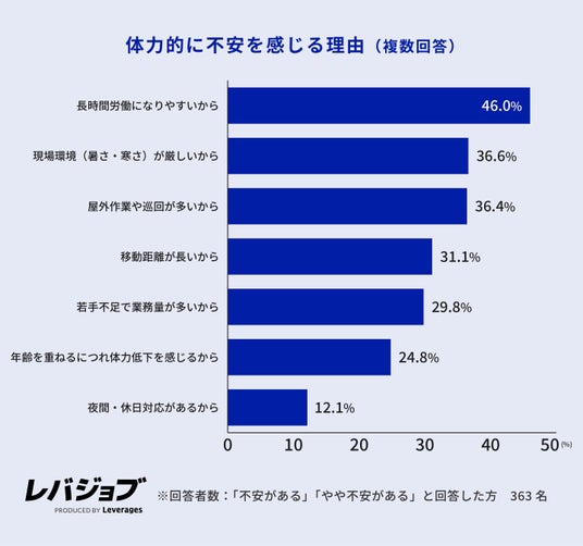 一方で、長く働き続けることに対しては、「体力面に不安がある(18.5%)」「やや不安がある(44.9%)」を合わせ、6割以上が体力面への不安を感じていることが分かりました。不安の要因としては、「長時間労働になりやすい(46.0%)」「現場環境の厳しさ(36.6%)」などが挙げられており、労働環境の改善や働き方の見直しが重要な課題であることが分かります。