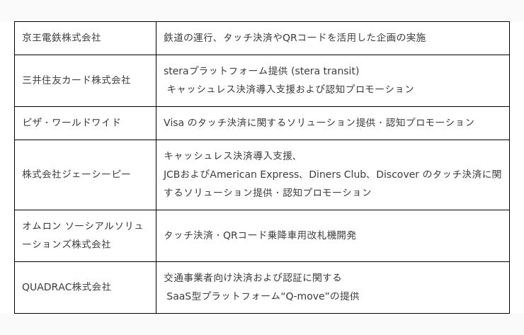 京王電鉄株式会社(本社:東京都多摩市、代表取締役社長:都村智史、以下「京王電鉄」)、三井住友カード株式会社(本社:東京都江東区、代表取締役社長:大西幸彦、以下「三井住友カード」)、ビザ・ワールドワイド・ジャパン株式会社(本社:東京都千代田区、代表取締役社長:シータン・キトニー)、株式会社ジェーシービー(本社:東京都港区、代表取締役兼執行役員社長:二重孝好、以下「JCB」)、オムロン ソーシアルソリューションズ株式会社(本社:東京都港区 代表取締役社長:四方克弘、以下「オムロン ソーシアルソリューションズ」)、QUADRAC株式会社(本社:東京都港区、代表取締役社長:高田昌幸、以下「QUADRAC」)は、「タッチ決済対応のカード(クレジット、デビット、プリペイド)や、同カードが設定されたスマートフォン等」および「QRコード」※を活用した乗車サービスに関する実証実験を、2023年度中に一部の駅にて、2024年度内に全駅を対象に開始することを以下の通りお知らせします。