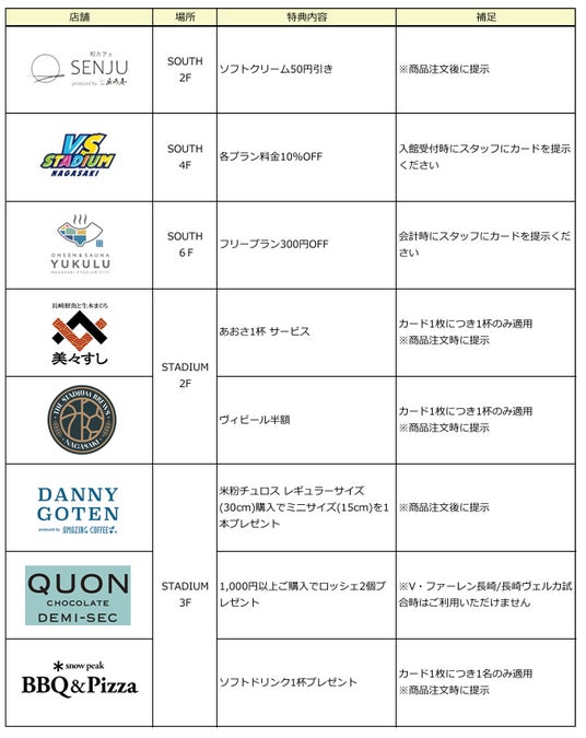 長崎スタジアムシティ内の一部店舗において、三井住友カードのナンバーレスカード・Olive(オリーブ)をお持ちのお客様を対象とした優待特典を提供致します。現時点で優待対象となる店舗及びサービスは以下となります。