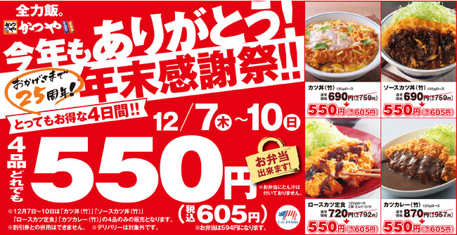 そこで、日頃より「かつや」を応援してくださるお客様に感謝の気持ちを込めて、2023年12月7日(木)~10日(日)の4日間限定で「年末感謝祭」を開催いたします。