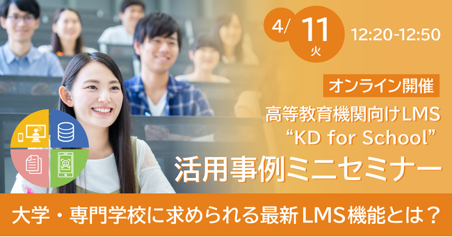 導入実績2000超を誇るeラーニング専門ソリューション企業、株式会社デジタル・ナレッジ(本社:東京都台東区、代表取締役社長:はが弘明)は、2023年4月11日(火)12時20分より30分間、<高等教育機関向けLMS “KD for School”>活用事例ミニセミナー「大学・専門学校に求められる最新LMS機能とは?」をオンライン開催いたします(https://www.digital-knowledge.co.jp/archives/31543/?pr)。また、3月17日(金)開催分も受付中です(https://www.digital-knowledge.co.jp/archives/30736/?pr)。