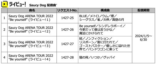 株式会社第一興商は、「LIVE DAM AiR」および「LIVE DAM Ai」の限定コンテンツ「ライビュー!」において、Saucy Dogが今年6月に大阪城ホールで開催した初のアリーナツアー『Saucy Dog ARENA TOUR 2022 “Be yourself”』のライブ映像を、2024年1月5日より期間限定で独占配信します。