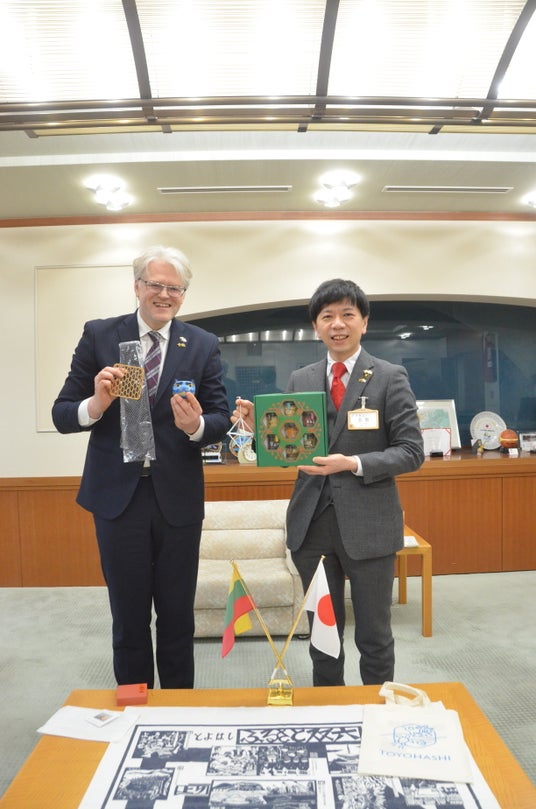 駐日リトアニア共和国の特命全権大使オーレリウス・ジーカス博士が初めて豊橋市長を訪問され、今年度リトアニア学習に取り組み、「第16回ESD大賞」で優秀賞を受賞した磯辺小学校児童との交流会も行われました。