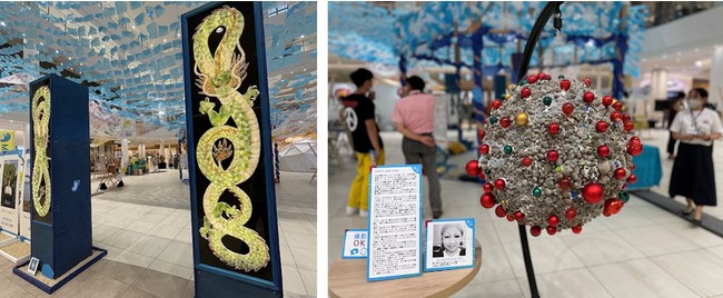 会場入り口に展示された、海岸に流れ着くシーグラスをアートにする黒島春奈さんの作品「龍宮城の手紙」が来場者をお出迎えし、会場上部に展示されたごみ袋で作られたクジラの体内には間違って食べてしまった「ごみ」が体内に入っているように表現されるなど、海洋ごみ問題を作品を通じて伝えました。