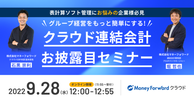 なお、2022年9月28日(水)に、『マネーフォワード クラウド連結会計』についてわかりやすくご紹介する「グループ経営をもっと簡単にする!マネーフォワード クラウド連結会計お披露目セミナー」を開催します。