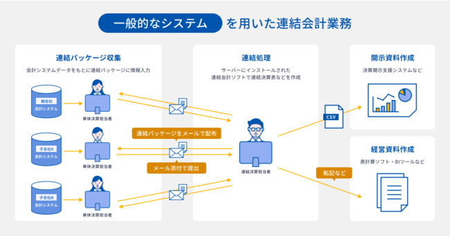 しかし、連結会計システムはオンプレミス型のサービスが主流で、連結決算を行うためのデータ収集用のフォーマットである連結パッケージをメールでやりとりしています。これらの運用は、コミュニケーションコストが高く、また、システムに合わせたデータの変換や、転記の手間も発生しています。