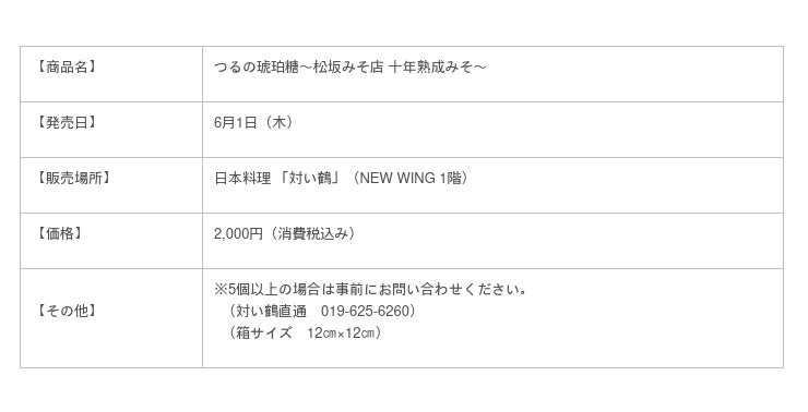 ホテルメトロポリタン 盛岡 (本館:所在地/盛岡市盛岡駅前通、NEW WING:所在地/盛岡市盛岡駅前北通 総支配人/佐藤隆)は、NEW WING1階日本料理「対い鶴」で販売している「つるの琥珀糖」から新フレーバーとして、花巻市大迫町で安心・安全な天然醸造、無添加、長期熟成のこだわりを持ってみそ作りをしている「松坂みそ店」の十年熟成みそを使用した琥珀糖を販売いたします。