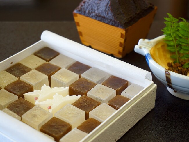 岩手県産の素材を使用し、日本料理の職人が一つひとつ丁寧に仕上げた、外はシャリっと、中はプルっとしたふたつの食感が楽しめる日本の伝統的な和菓子。常温での保存が可能のため、特別な方へのご贈答や大切な方とのひと時にご利用いただける一品です。