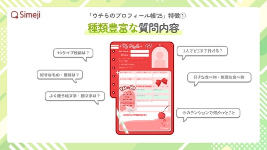 「ウチらのプロフィール帳’25」は、こうした潮流に合わせて誕生した、スマホで完結する新しいプロフィール帳です。Simejiは、“話すきっかけ”を、より簡単に、よりスマートに叶えることで、円滑なコミュニケーションを後押しいたします。