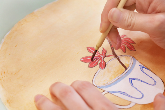 日本画の画材の体験ができます。 横浜美術館コレクション作品の安田靫彦(やすだ・ゆきひこ)の「紅花青花」を参考に、器と秋のモチーフを組み合わせて、ちいさな絵を描いてみましょう。
