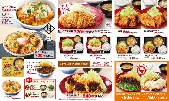 定番メニューの「カツ丼(梅)80gロース」は540円(税込594円)。定食メニューで人気の、サクサクな⾐とやわらかなお肉を味わえる「ロースカツ定食 120gロース」は720円(税込792円)と、お手頃価格で「とんかつ」をお楽しみいただけます。